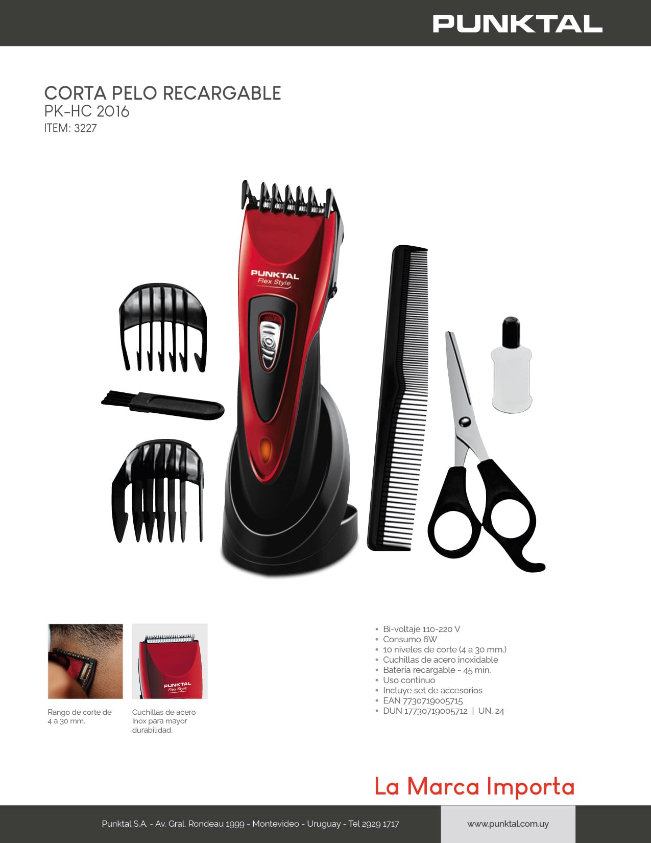 La Cortadora De Pelo Punktal PK-HC2016 Recargable es perfecta para un corte preciso y profesional. Con cuchillas de acero inoxidable y 10 niveles de corte ajustables (4 a 30 mm), ofrece 45 minutos de uso continuo. Incluye un set de accesorios y funciona con bi-voltaje 110-220V. Ideal para mantener tu estilo de forma cómoda y eficiente.